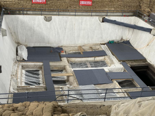 2020年9月起,一號墓發(fā)掘工作開始。至2023年11月,完成封土和填土發(fā)掘,12月提取了槨室上鋪設(shè)的竹席。這期間,建設(shè)了一號墓現(xiàn)場保護(hù)大棚和文物庫房、文物保護(hù)實驗室、宿舍等必要的配套設(shè)施。2024年3月7日開始拆解提取槨蓋板,至3月27日,四層槨蓋板已全部安全提取完成,共計443根,總重約153噸。現(xiàn)已進(jìn)入槨室發(fā)掘第二階段,即槨室內(nèi)部的發(fā)掘清理。